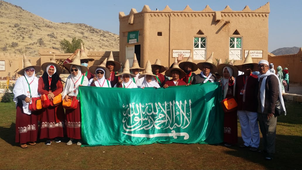 Jamaah umrah berfoto di depan Almoogi Museum, Arab Saudi, dengan mengenakan kostum khas dan membawa bendera Arab Saudi sebagai simbol persaudaraan dan penghormatan budaya.