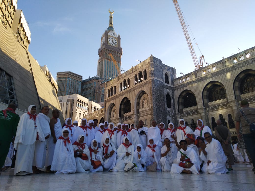 Foto bersama jamaah haji di Masjidil Haram, Mekkah, dengan latar belakang menara jam yang ikonik, menunjukkan semangat kebersamaan dalam melaksanakan ibadah umrah