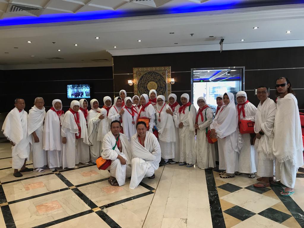 Rombongan jamaah berkumpul di depan lobby hotel, siap untuk perjalanan ibadah